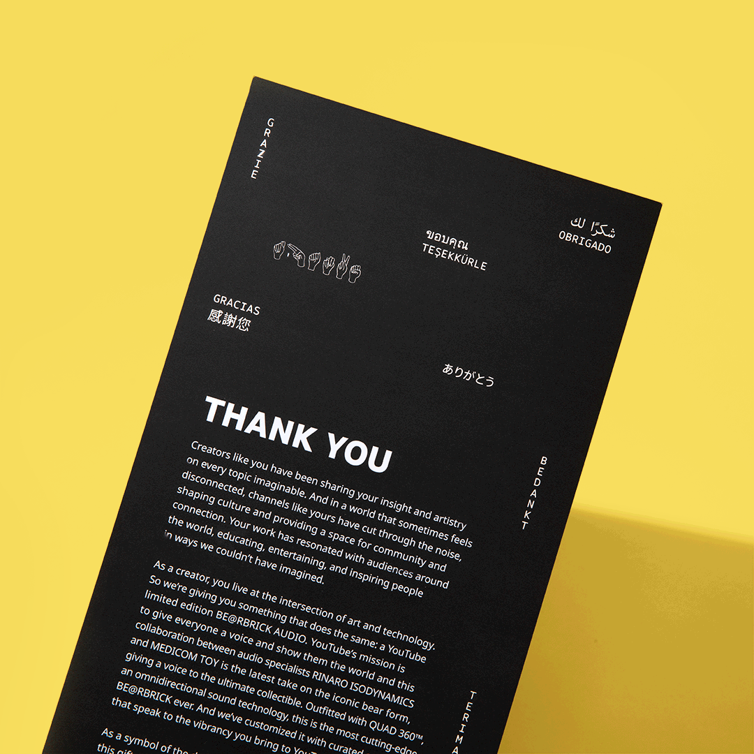 Each BE@RBRICK™ AUDIO was customized with thoughtful details celebrating the individual creator — including their channel name, the year they joined YouTube, and a YouTube logo placed proudly on the chest.